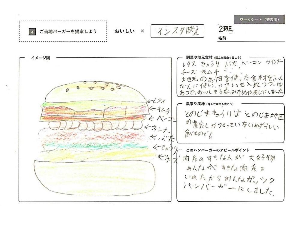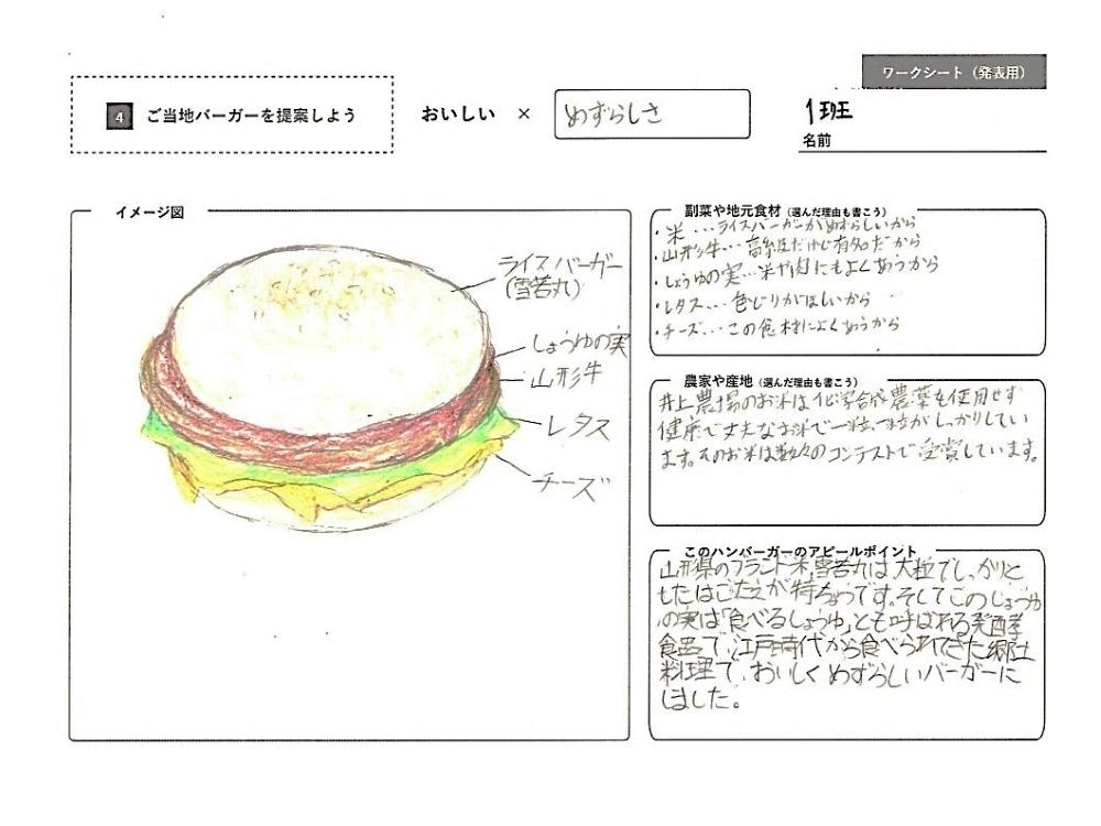 授業では、地元のブランド米「雪若丸(ゆきわかまる)」や「山形牛」などをふんだんに活用し、テーマに沿ったアイデアが発表されました。特に、地元のモスメンバーも知らなかった「外内島(とのじま)きゅうり」や「しょうゆの実」などめずらしい食材も使用されており、「モスバーガーの商品でも見たことがない!」といった驚きの声があがりました。食材のルーツや特徴も詳しく調べられていて、子どもたちのアイデアの独創性と熱意を感じました。