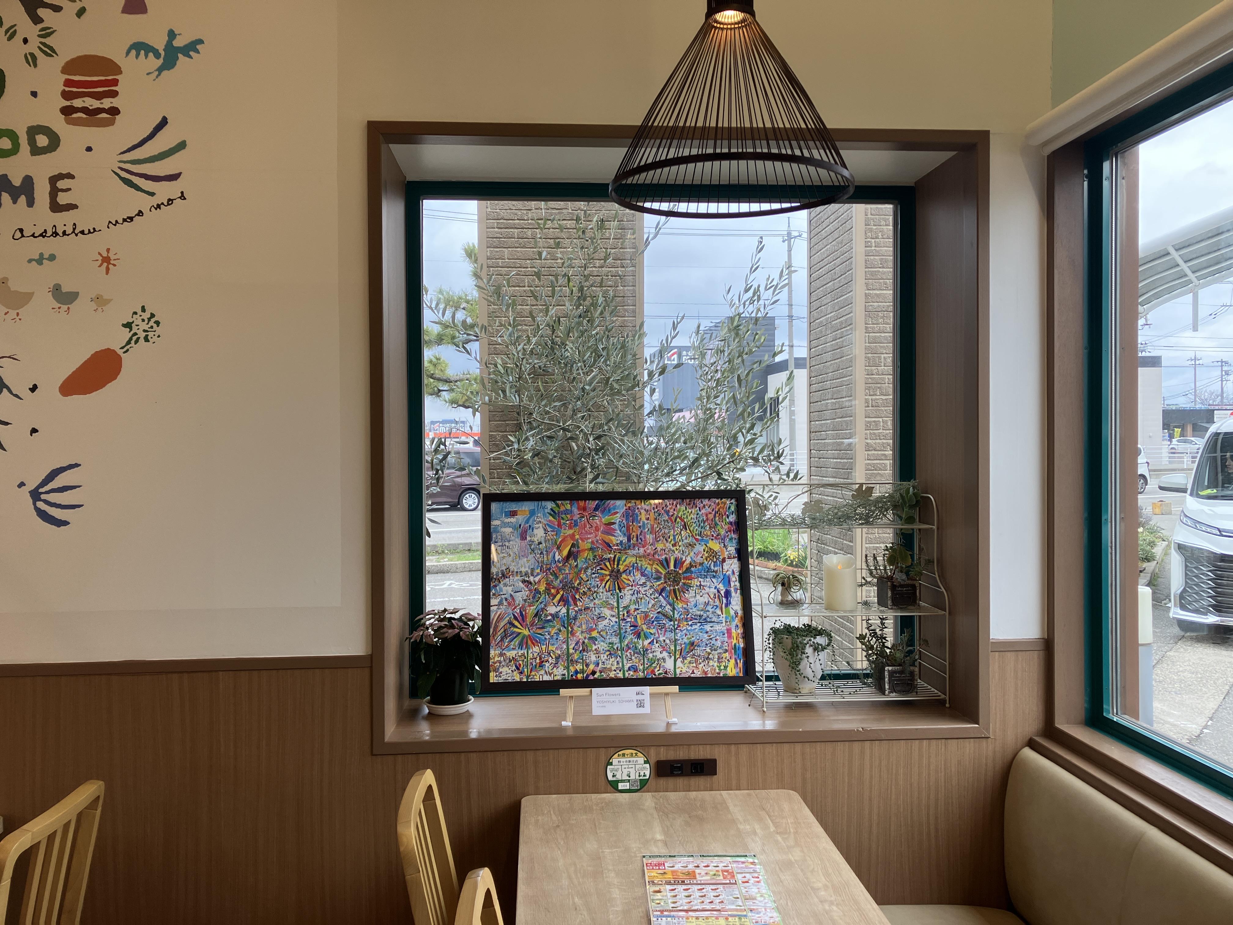新潟県内のモスバーガー21店舗では、店内にアート作品を展示し、心安らぐ空間を演出しており、2023年度は2か月毎に作品の入替を行っております。作品が変わるたびに雰囲気の異なるモスバーガーの店内で、おくつろぎください。