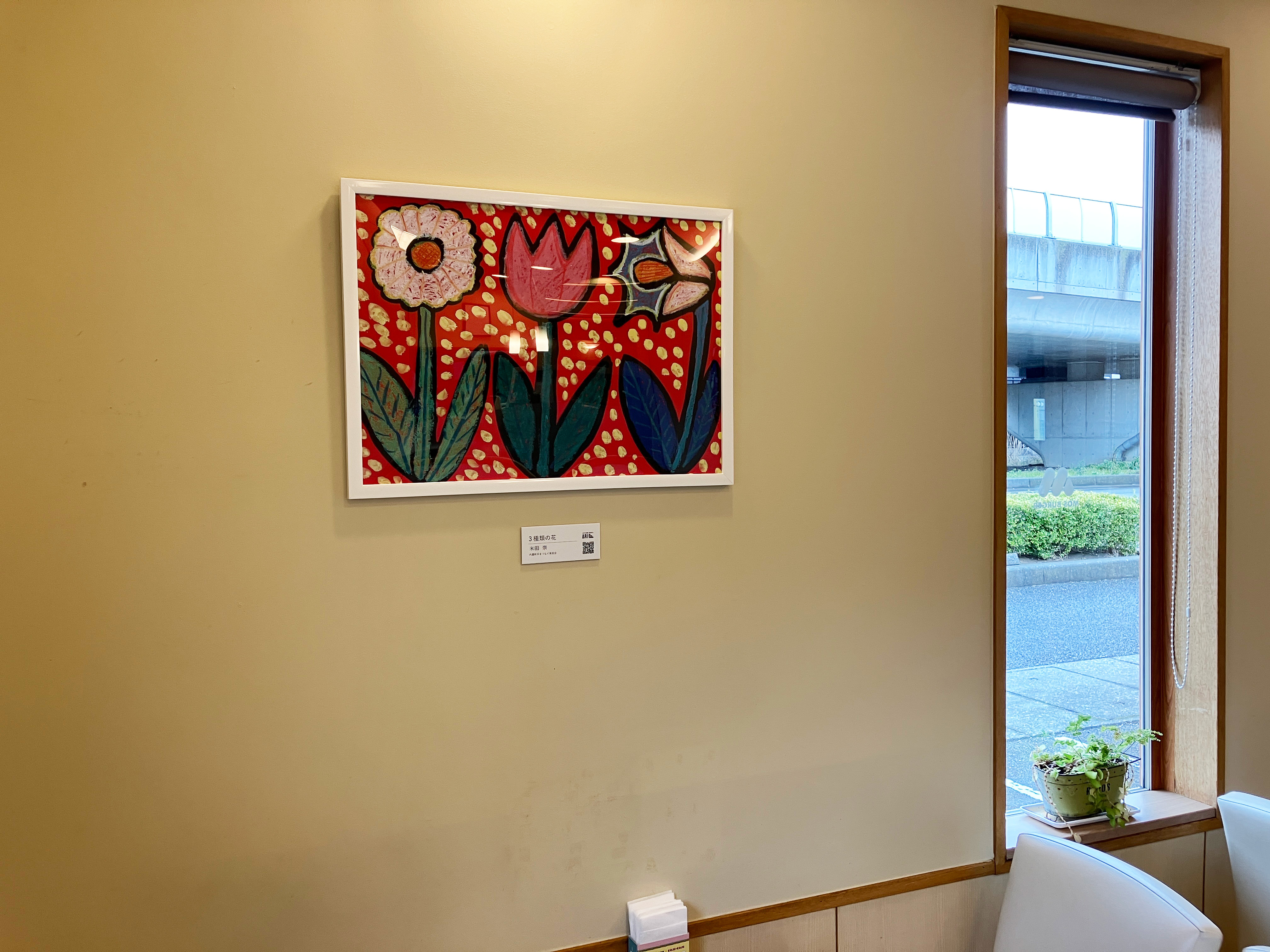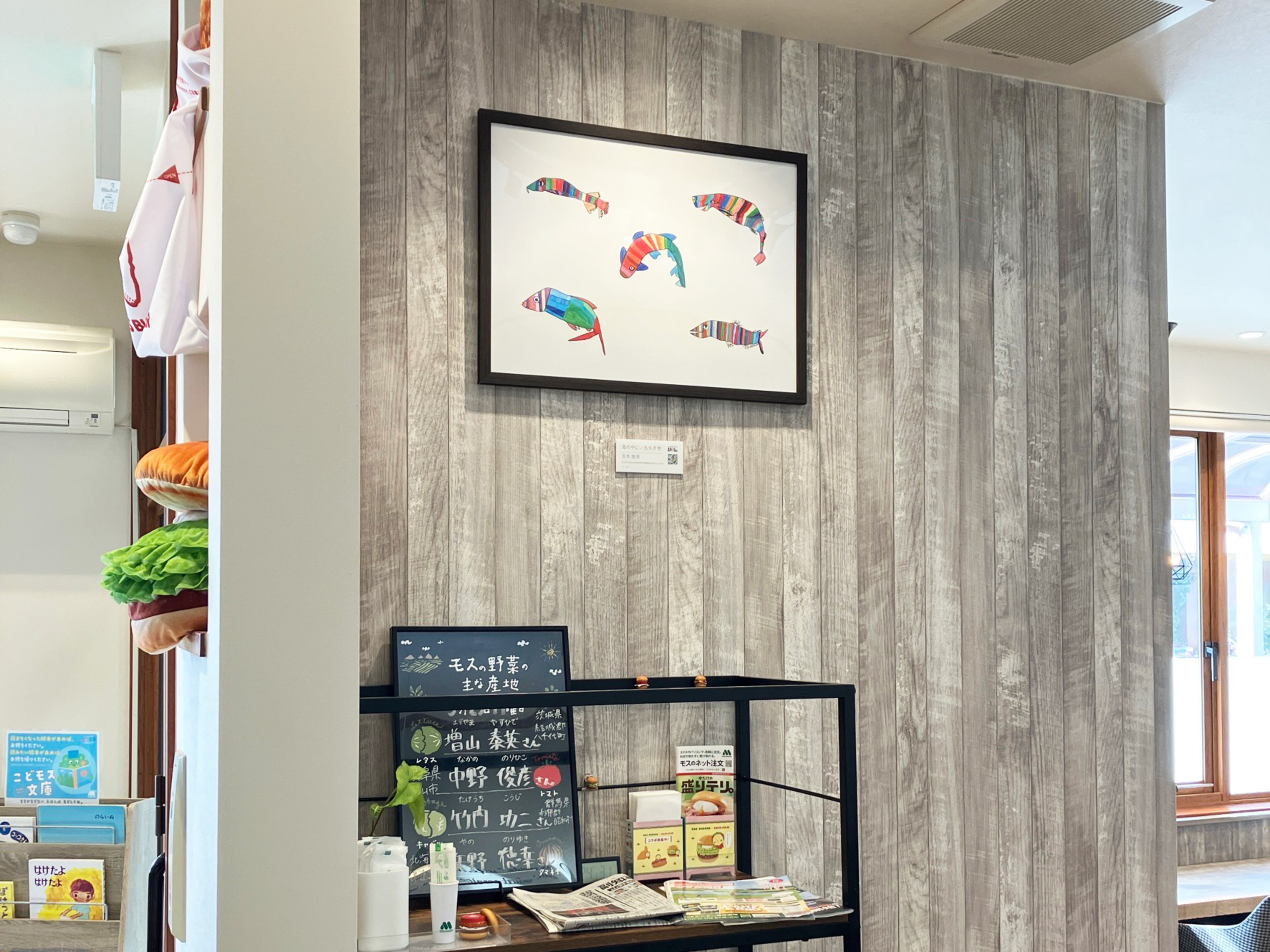 東京都文京区のモスバーガー本郷三丁目店では、文京区が主催する「街なかアートプロジェクト」に賛同し、障がいのある方のアート作品を店内に展示しています。