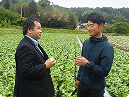 「都丸さんは、若いですが向上心がありとても勉強熱心。そして何よりレタス栽培への熱い想いは目を見張るものがあります!!」と語っていただいたのは、野菜くらぶ営業部部長の河原さん。野菜くらぶは、群馬県昭和村を拠点に、青森、静岡、岡山に圃場を持っています。最低月1回は、各圃場を巡回しているそうです。それに加えて、野菜くらぶ群馬のレタス部会の取りまとめ役も行っています。